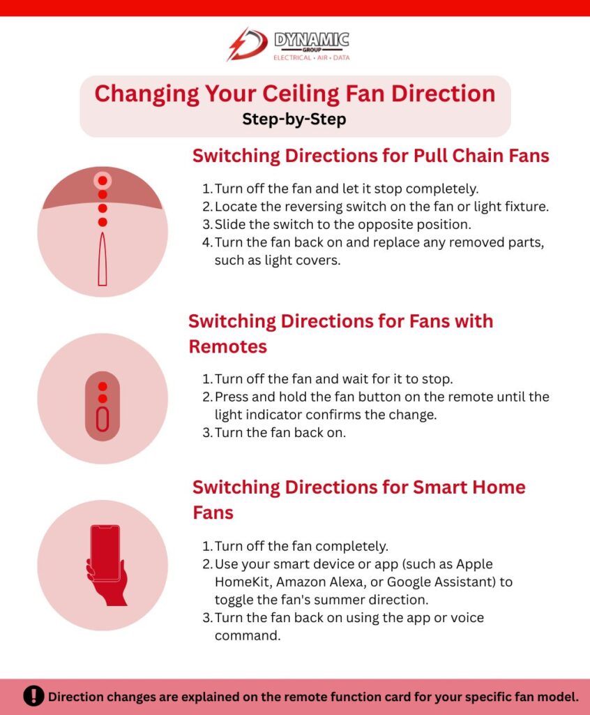 If you’re unsure how to change the direction of your ceiling fan, need a new fan installed, or want to upgrade to a more efficient model, Dynamic Group can help.